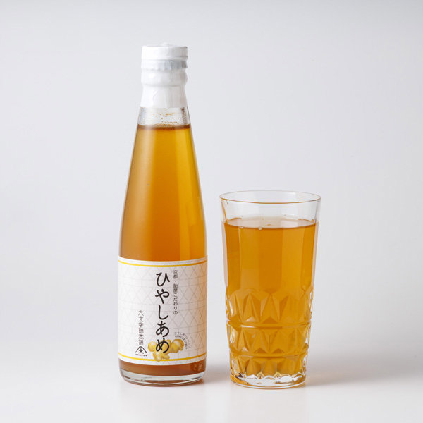 ”あめ”は舐めるお菓子ですが、こちらの「ひやしあめ」は京都大阪を中心に関西地方で愛される生姜風味の"飲み物"です。当店オリジナルのレシピと材料を使用。麦芽飴に根しょうがをたっぷりと使用し、砂糖とハチミツで味を整えています。保存料は使用せず、生姜そのものを生搾りした自然素材ですから、やさしい甘さと、すっきりした後味が、蒸し暑い夏を一時忘れさせてくれます。生姜風味は、エアコンの冷えを感じた時ににも最適です。