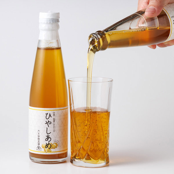”あめ”は舐めるお菓子ですが、こちらの「ひやしあめ」という商品は京都大阪を中心に関西地方で愛される生姜風味の"飲み物"です。当店オリジナルのレシピと材料を使用した飴屋の特製品です。麦芽飴に根しょうがをたっぷりと使用し、砂糖とハチミツで味を整えています。保存料は使用せず、生姜そのものを生搾りした自然素材ですから、やさしい甘さと、すっきりした後味が、蒸し暑い夏を一時忘れさせてくれます。生姜風味は、エアコンの冷えを感じた時ににも最適です。